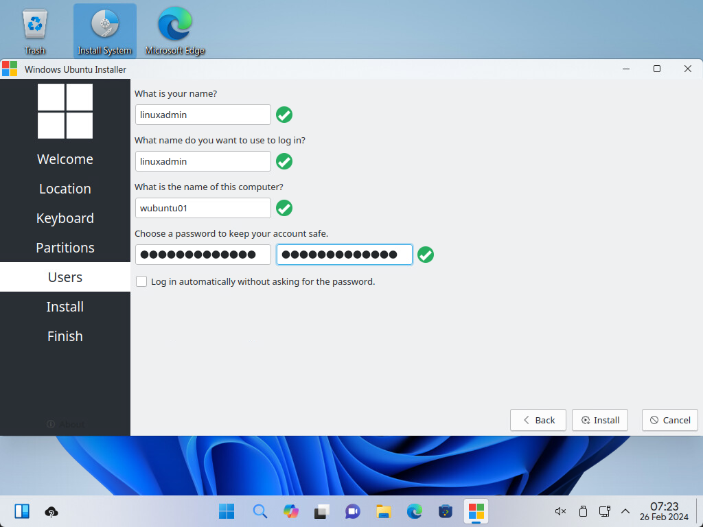 Configure your username and system name along with a user password. You can also set this option to automatically log in without asking for a password. Click Install.