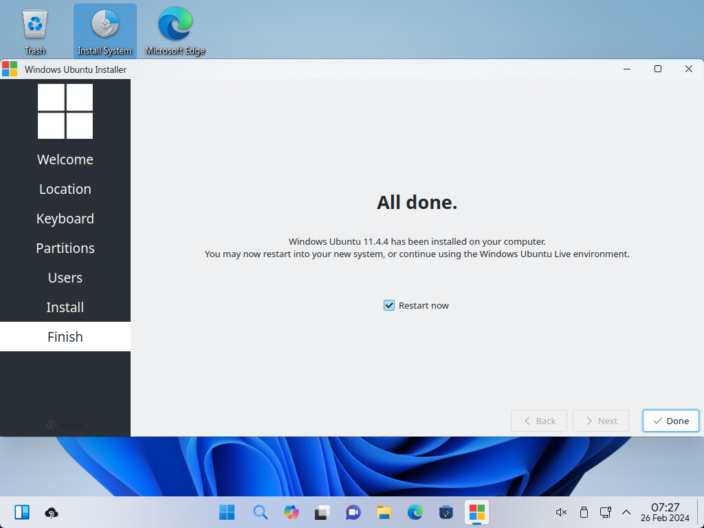 After a few minutes, the system will be installed. Click Done to restart the system.