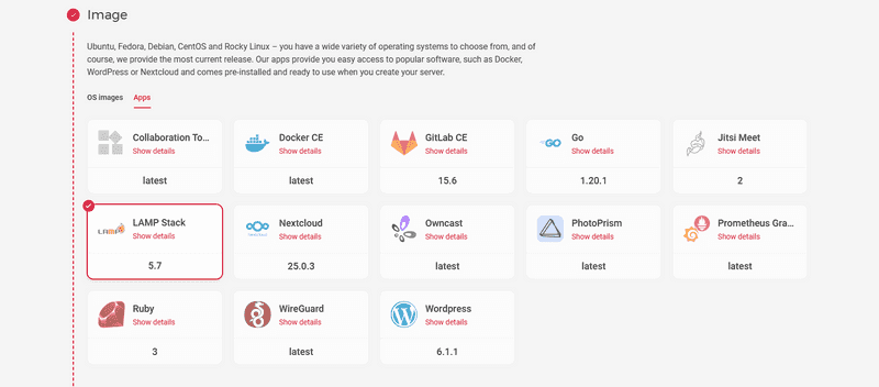 شما می توانید MySQL را به صورت دستی نصب کنید یا می توانید به سادگی برنامه “LAMP Stack” را هنگام ایجاد سرور انتخاب کنید.