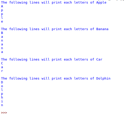 وقتی یک حلقه for در داخل حلقه for دیگری داریم، به آن حلقه for تو در تو می گویند. کاربردهای متعددی از یک حلقه for تو در تو وجود دارد. مثال لیست بالا را در نظر بگیرید. حلقه for کلمات جداگانه را از لیست چاپ می کند. اما اگر بخواهیم به جای آن، نویسه های جداگانه هر یک از کلمات موجود در لیست را چاپ کنیم، چه؟