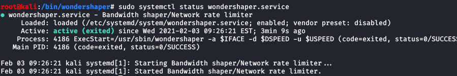 اکنون سرویس WonderShaper را Enable و راه اندازی می کنیم. در مرحله بعد، باید سرویس را فعال کنیم تا هر بار که سیستم بوت می شود، به طور خودکار شروع به کار کند. WonderShaper می تواند به عنوان یک سرویس مانند سیستم های لینوکس دیگر اجرا شود.