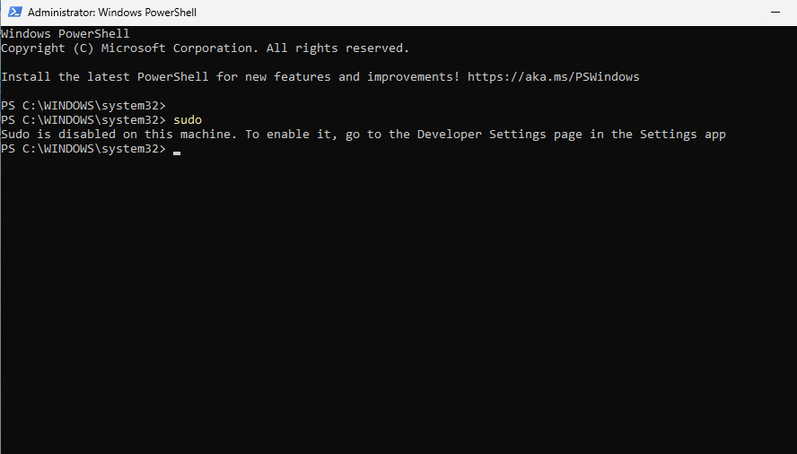 اگر فقط سعی کنید دستور sudo را از خط فرمان اجرا کنید، این پیام را خواهید دید که باید در تنظیمات توسعه دهنده فعال شود.