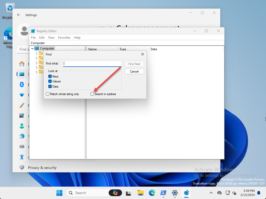 گزینه جدیدی در ویرایشگر رجیستری وجود دارد که امکان جستجو در زیردرخت را فراهم می کند. به کادر Find در تصویر زیر نگاه کنید.