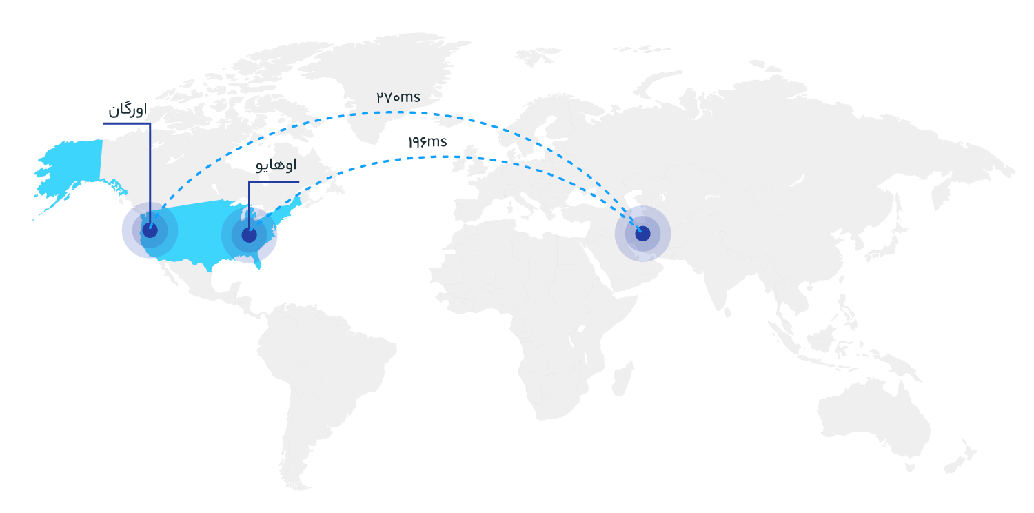 آمریکا 11،681 کیلومتر از ایران فاصله دارد و دیتاسنترهایی که سرورهای آمریکا را ارائه می‌دهند در واشینگتن، نیویورک، شیکاگو، تگزاس، اوهایو، اورگان، لاس وگاس، سانفرانسیسکو، ویرجینیای شمالی و کارولینای جنوبی هستند.